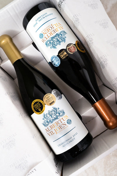 For the white wine enthusiasts! Two of Alvi’s Drift’s most-celebrated, multi-award-winning wooded white wines in a stylish gift box: Albertus Viljoen Chenin Blanc and Albertus Viljoen Chardonnay.